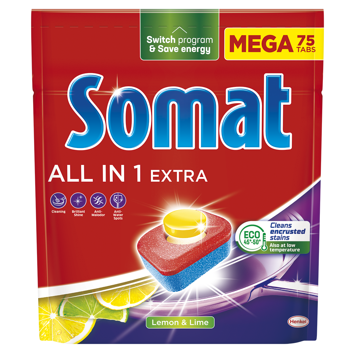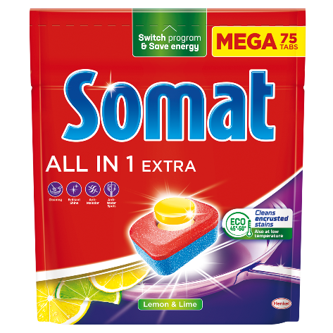 Tablety do myčky Somat All in One Extra Lemon 75ks Somat All-in-1 Extra Lemon & Lime tablety do myčky s vůní citronu a limetky neutralizující zápach 15000 bodů |