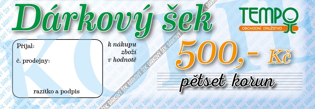 DÁRKOVÝ ŠEK v hodnotě 500 Kč Dárkový šek v hodnotě 500 Kč na nákup zboží v prodejnách TEMPO, obchodního družstva 15000 bodů |