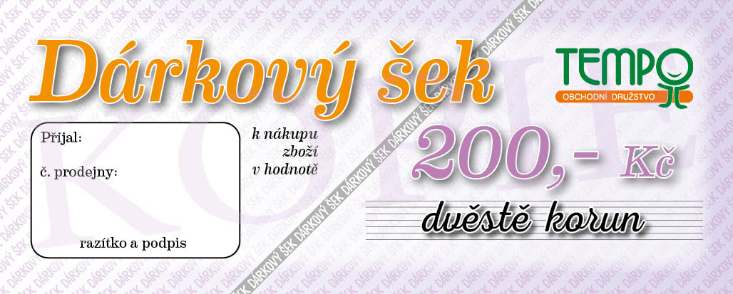 Dárkový šek v hodnotě 200 Kč Dárkový šek v hodnotě 200 Kč na nákup zboží v prodejnách TEMPO, obchodního družstva 10000 bodů |